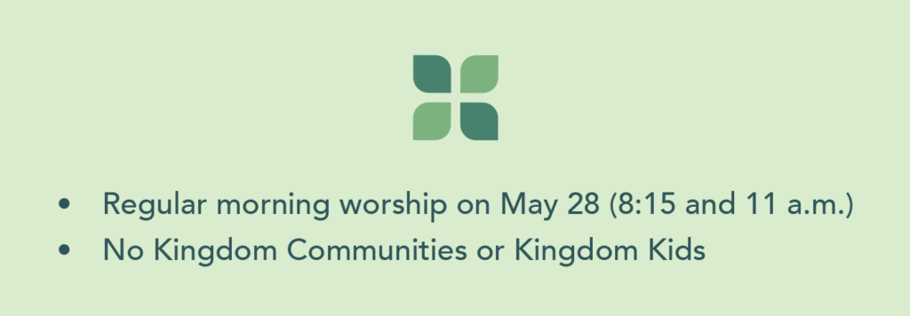| 9:45 a.m. | Kingdom Communities: All ages gather in smaller groups for teaching, fellowship, and prayer. |